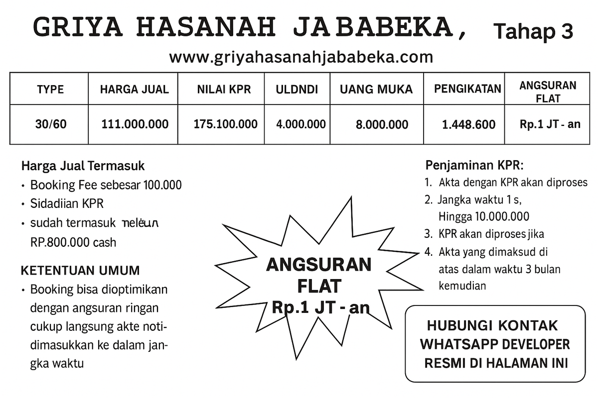 "Angsuran Flat Sampe Lunas, DP terjangkau, Bangunan Berkualitas Dinding Hebel dan Aksesnya Mudah."